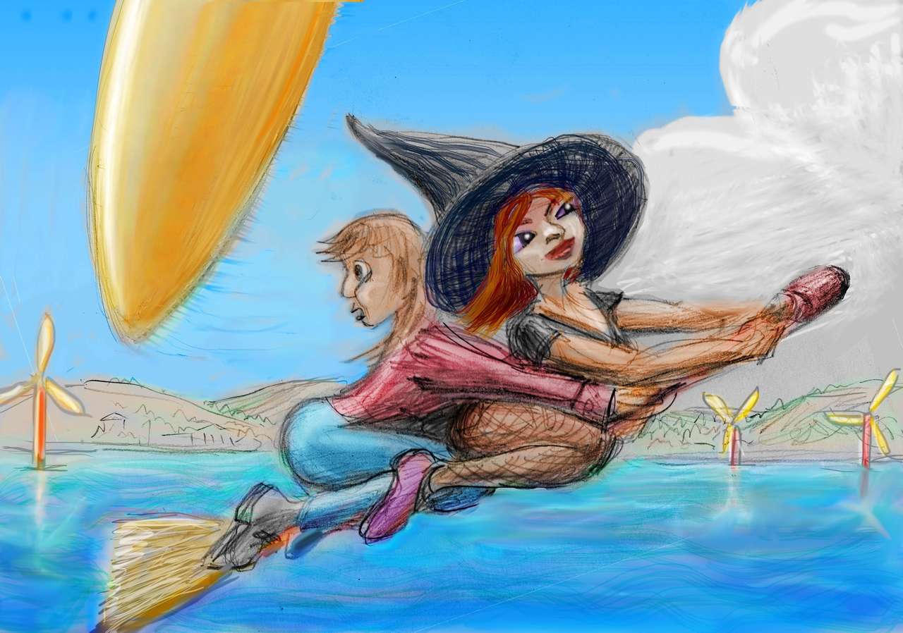 A classic pointy-hat witch gives me a flying lesson on her broom. We ride out over San Francisco Bay. The water looks wider and deeper than I recall--clear, deep indigo, not shallow, muddy green. One ruined old pier goes way out, a mile or two... with modern windmills on it, around it. Indeed, they dot the whole Bay, except a few shipping lanes.