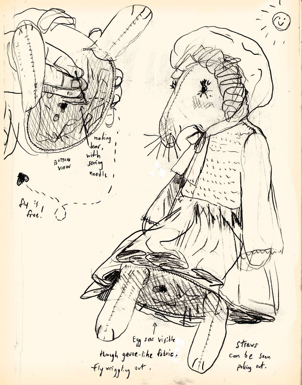 I took a sewing needle from E and used it to make a little tear in the fabric on the doll's bottom. They helped me hold the doll. We were excited.The fly spiraled happily away into the air (we were outside in the sun now) and I felt an extreme assurance that these things would come true.