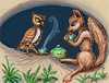 WOLF AND BURROWING OWL: by Wayan; 1999/12/5, a scientific fairytale dream. A shy burrowing owl invites her friend, an easy-going wolf, over for tea. It sounds very Beatrix Potter, but in fact... |