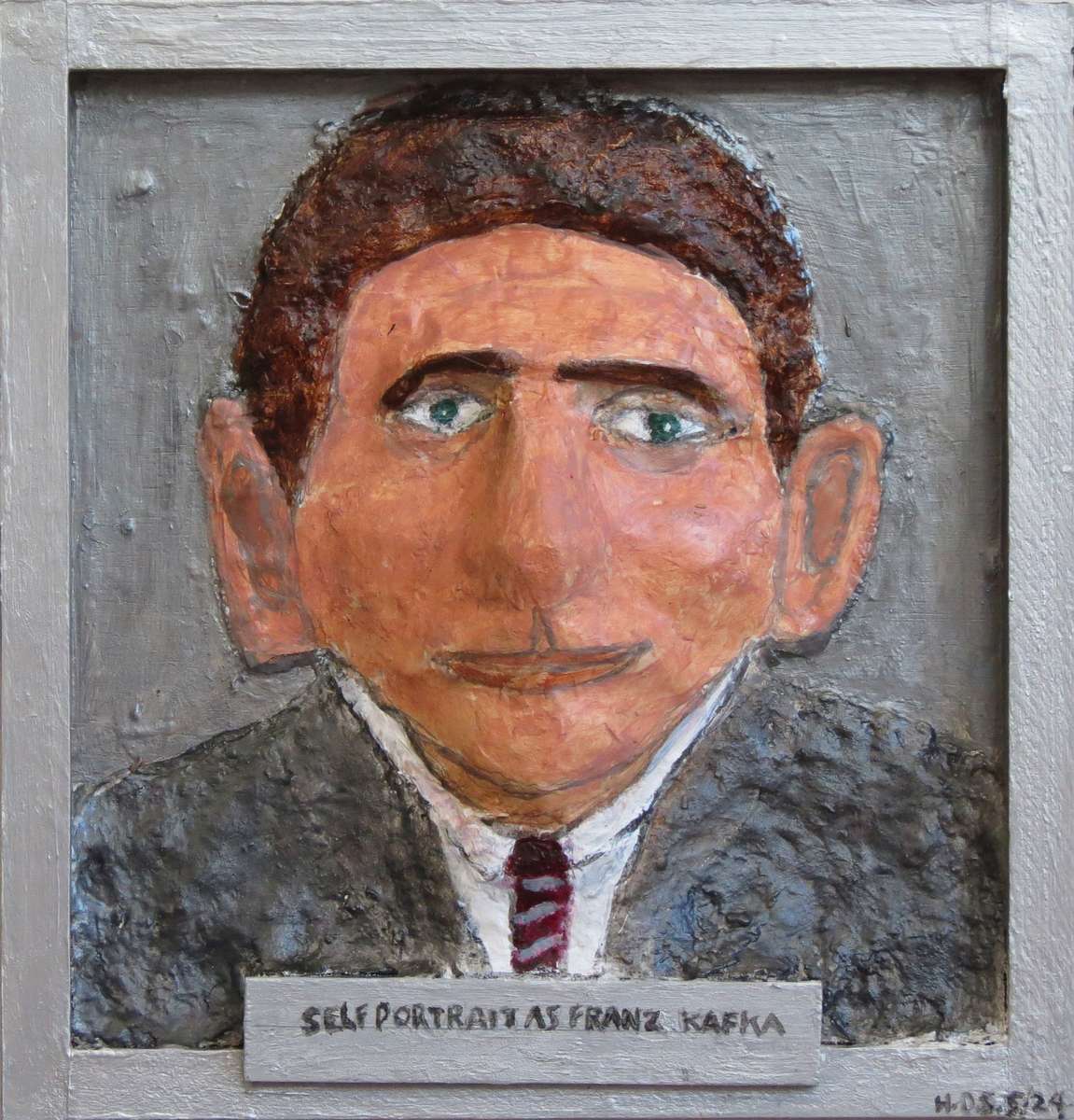 SELF-PORTRAIT AS FRANZ KAFKA (enlarge) Acrylic on molded paper-maché mask with celluclay on wood, 12" square, May 2024 © by Henry Sultan