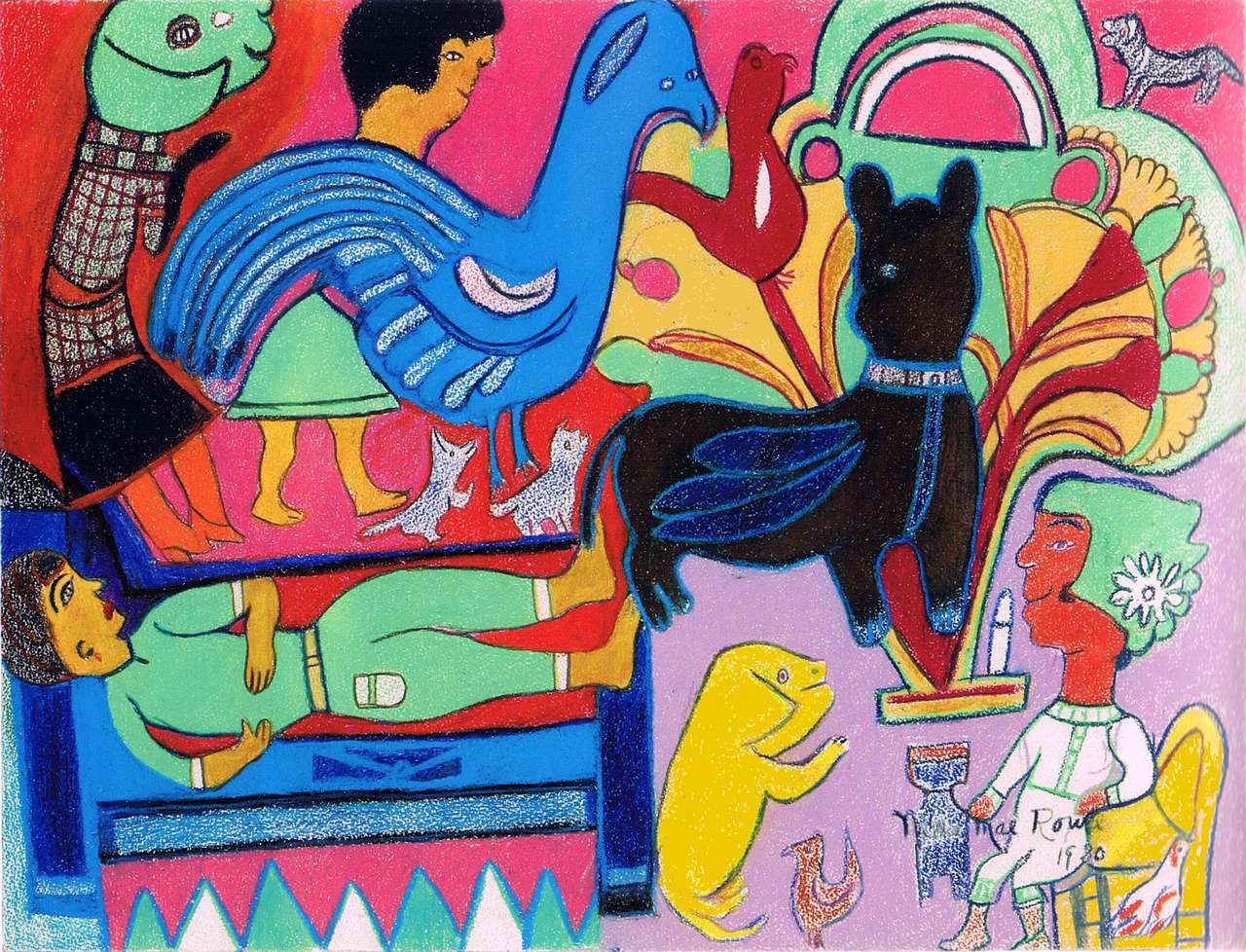Nellie Mae Rowe was a folk artist in Georgia in the 1970s and 80s. Like Grandma Moses, most of her art dates to her old age, after she'd retired. She had to work through most of her childhood, so she explicitly wanted to play with art like the kid she'd never gotten to be. I think she achieved that freedom.