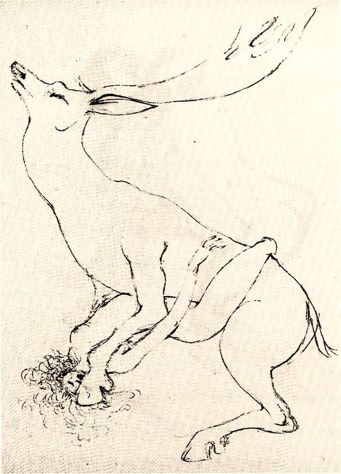 Not a dream. Fini had a brief intense affair with a married man. She wrote up fantasies about their clandestine encounters, and repeatedly drew him as a stag making love to her. Her lack of sharp boundaries between human and animal are notable in all her work; more evidence she was a furry long before the term existed.