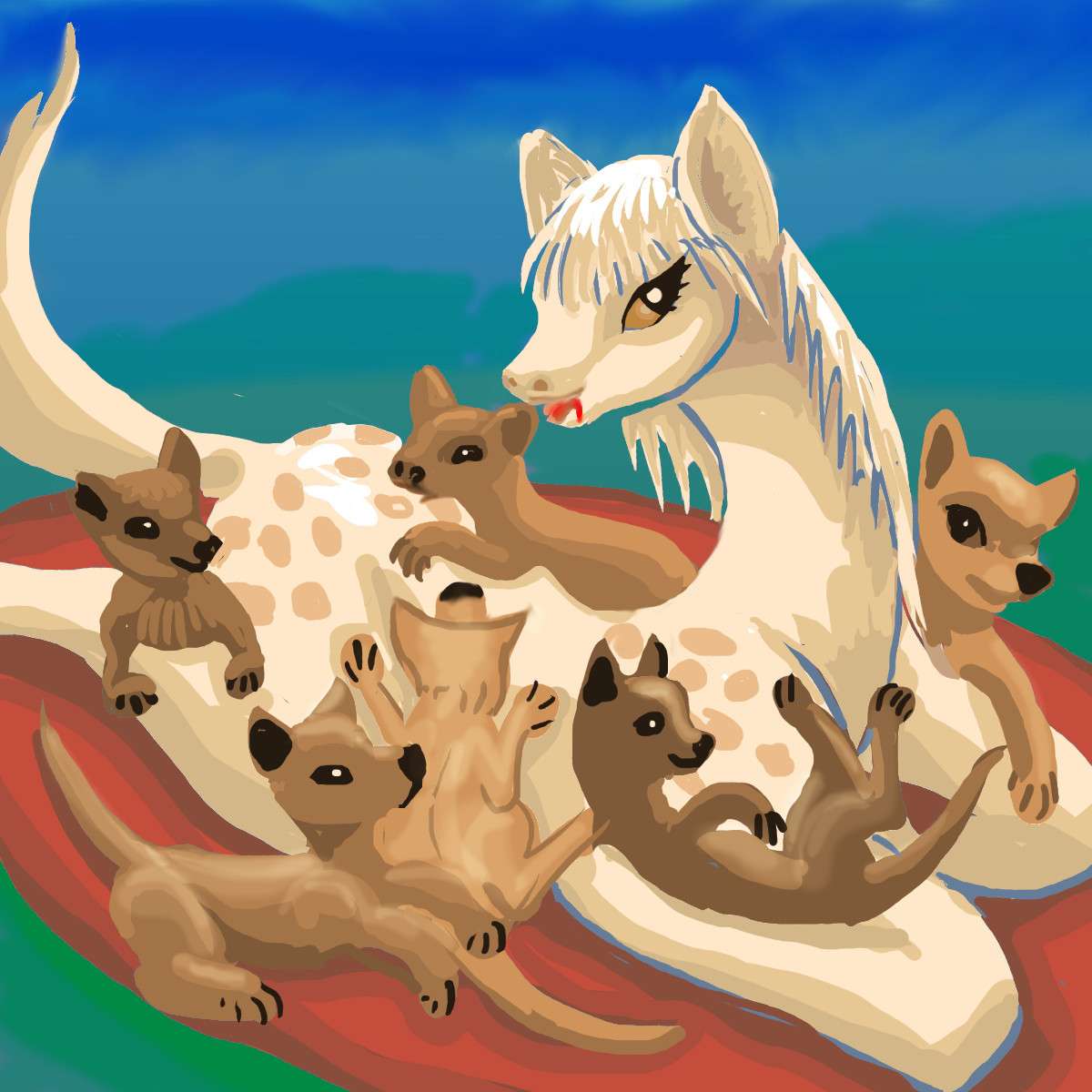 She's curled up in a big nest. Around her in it, are smaller mammals, not her young but another species that often nests with this one, likes to sleep on top like cats do on humans. They form a patchy but warm living blanket.